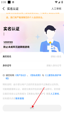2、完善真实姓名、身份证号之后提交等待审核即可。
