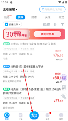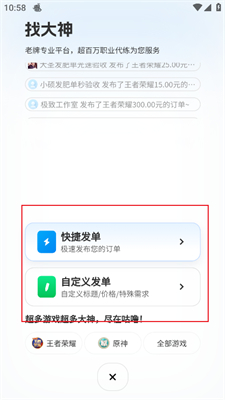 在线发布代练或陪玩订单,支持多种游戏,如英雄联盟、王者荣耀、和平精英等。