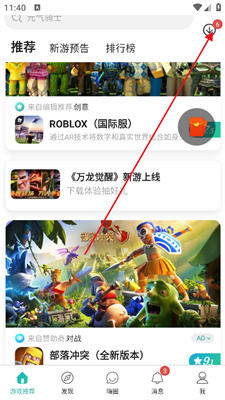 1、在游戏推荐栏点击右上角的下载按钮。