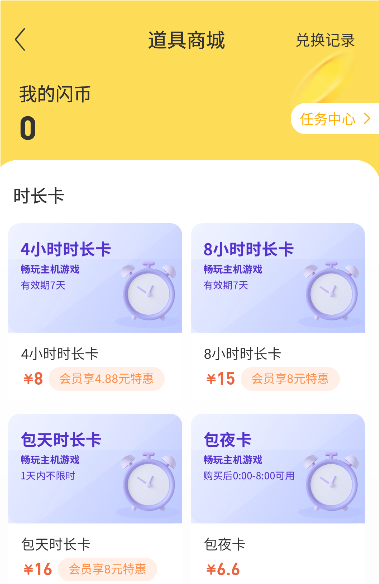 4、也可以通过完成任务,获得闪币,在闪币兑换区域,解锁云游戏时间。