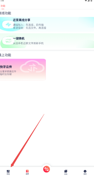 1、下载安装快牙,我们能够看到很多实用功能,点击左下角的本地;