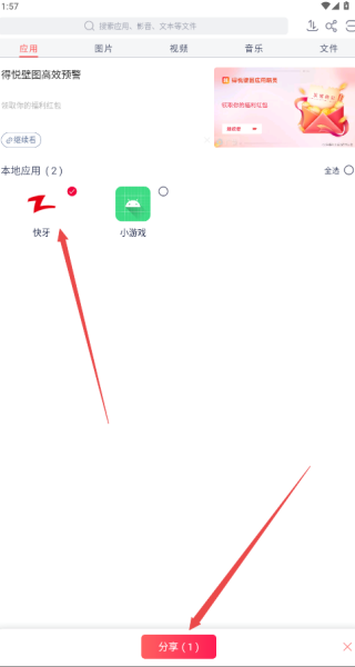 3、找到要传输的应用,勾选应用后面的圆圈,点击下方的分享;