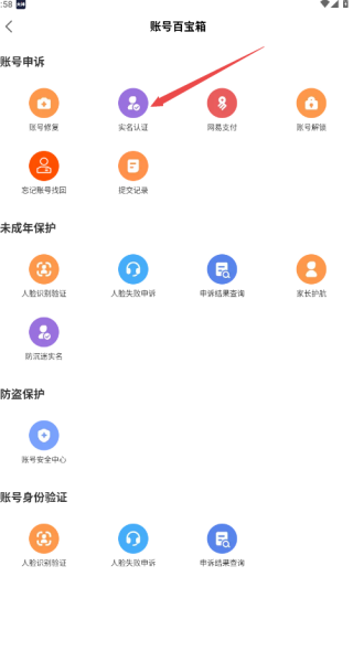 2、在账号申诉里面,选择实名认证,点击进入跳转页面;
