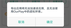 3、注意的是,导出应用将无法加速该应用,且无法使用OurPlay中的虚拟环境。