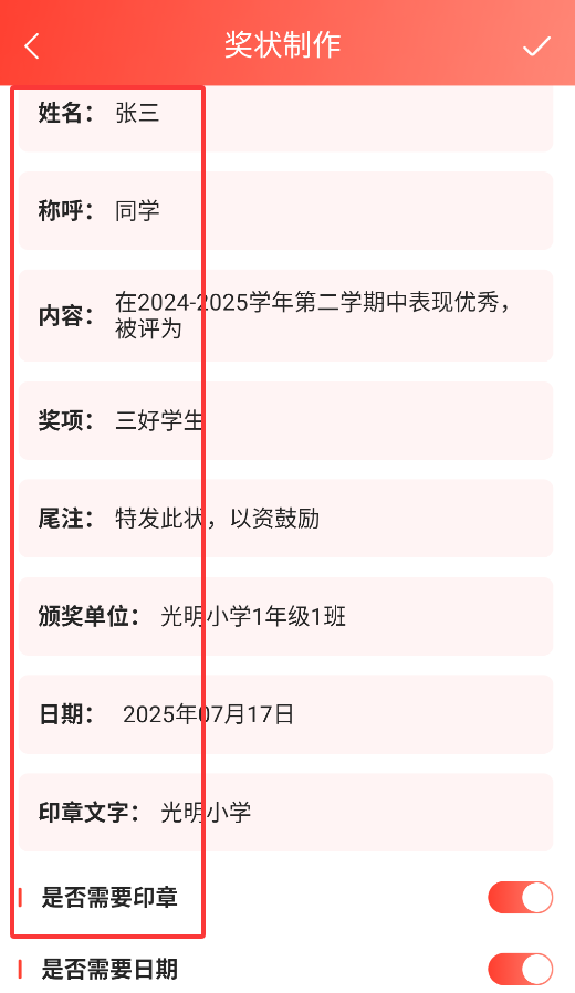 3、在编辑页面填写获奖者姓名、表彰内容、奖项名称、落款日期、电子印章等完整信息。