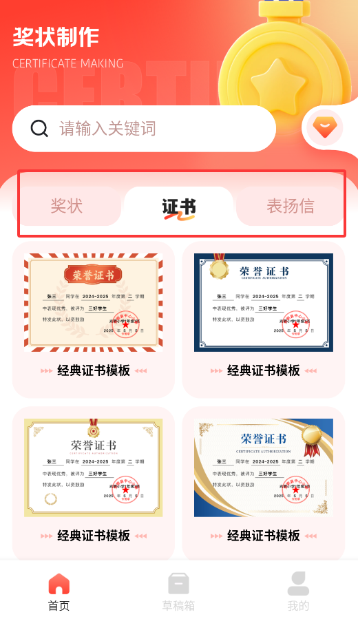 4、所有未完成的奖状设计都会自动保存在草稿箱,方便随时继续编辑或管理已制作的作品。