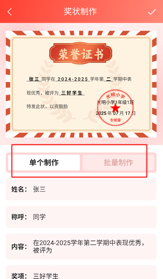 2、选择心仪模板后,可根据需求选择"单张制作"或"批量生成"不同数量的奖状。