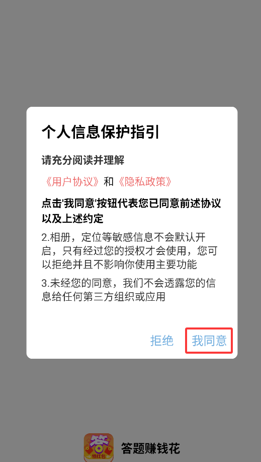 1、首次打开应用会显示用户协议页面,点击确认按钮后方可进入答题赚钱主界面。