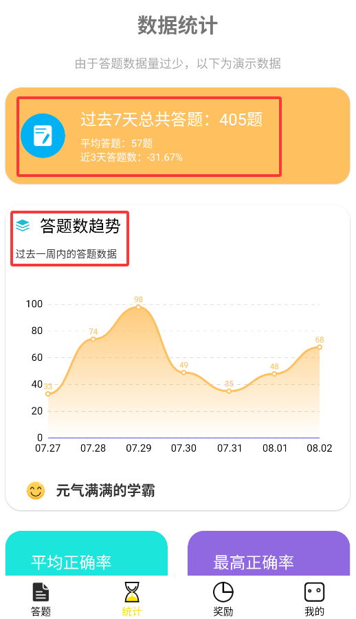 3、数据统计页详细展示历史累计答题数,并以折线图形式呈现近期答题数量变化趋势。