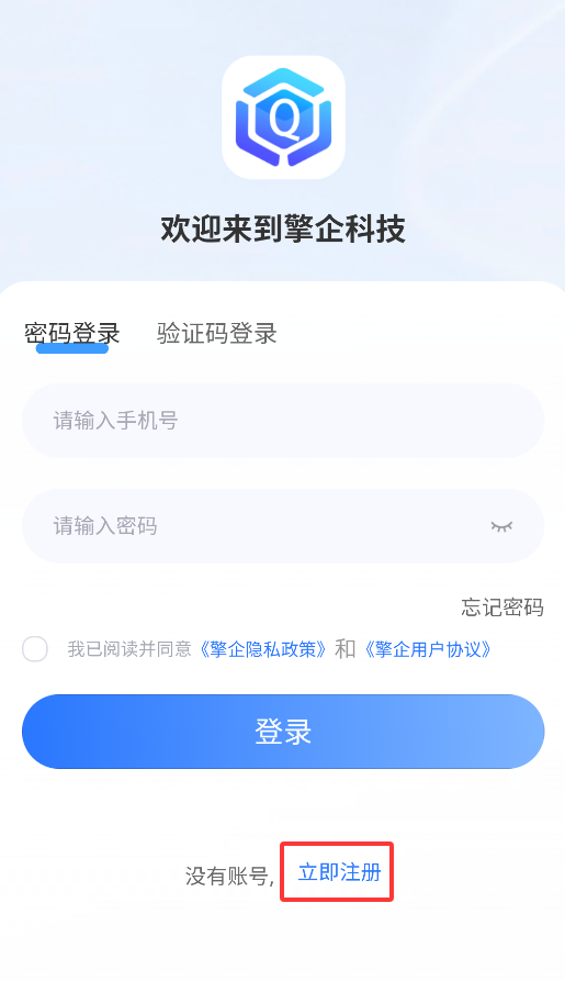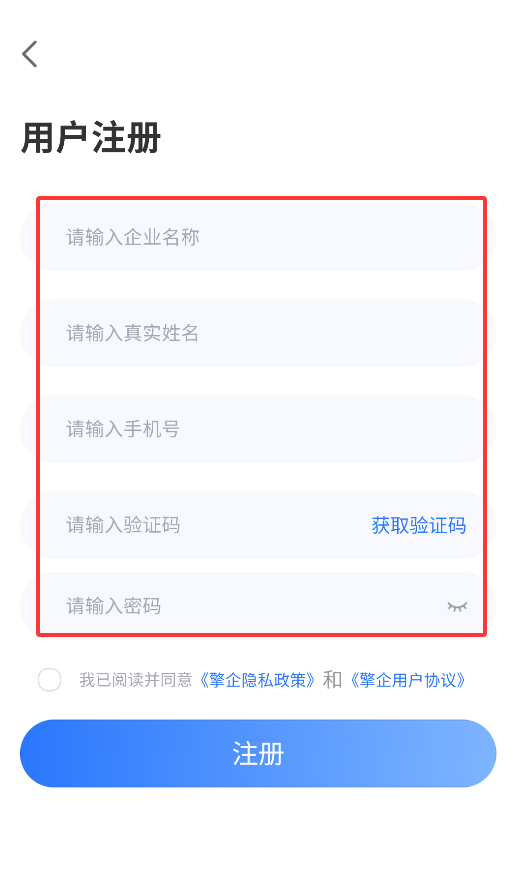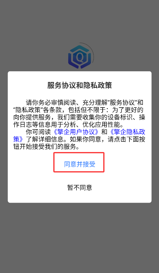 1、首次启动APP会显示服务协议和隐私政策,点击"同意"按钮后进入企业注册页面。