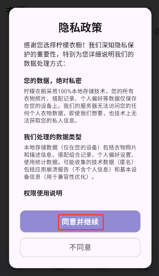 1、首次启动APP会弹出用户协议,点击"同意"后即可进入智能衣橱管理平台主界面。