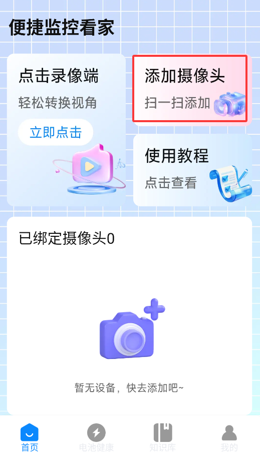 2、在APP首页点击"添加设备"按钮,选择"摄像头"类型开始配置流程。