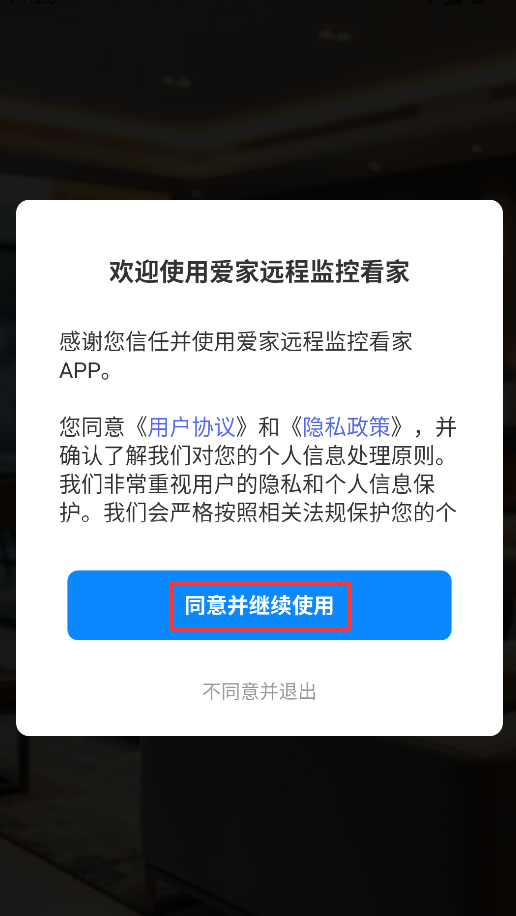1、首次启动爱家远程监控APP时,系统会弹出用户协议,点击"同意"后才能进入主界面。