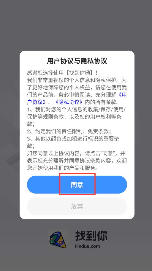 1、首次启动"找到你呦"APP时,系统会弹出用户协议窗口,点击"同意"后方可正常使用所有功能。