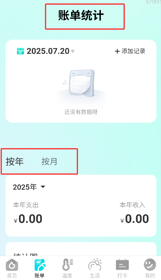 3、进入"账单"页面可按年月筛选查看历史用气数据和费用明细。
