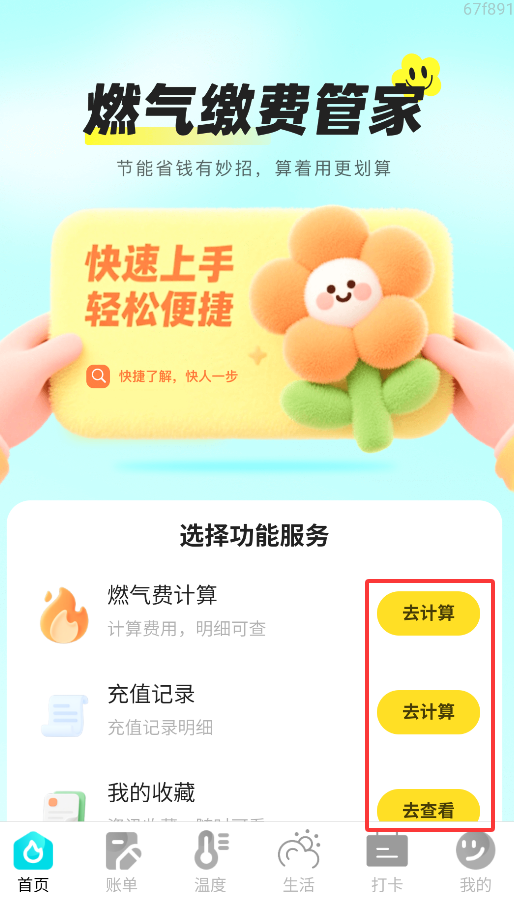2、首页提供燃气费计算、充值记录查询及常用地址收藏等实用功能。