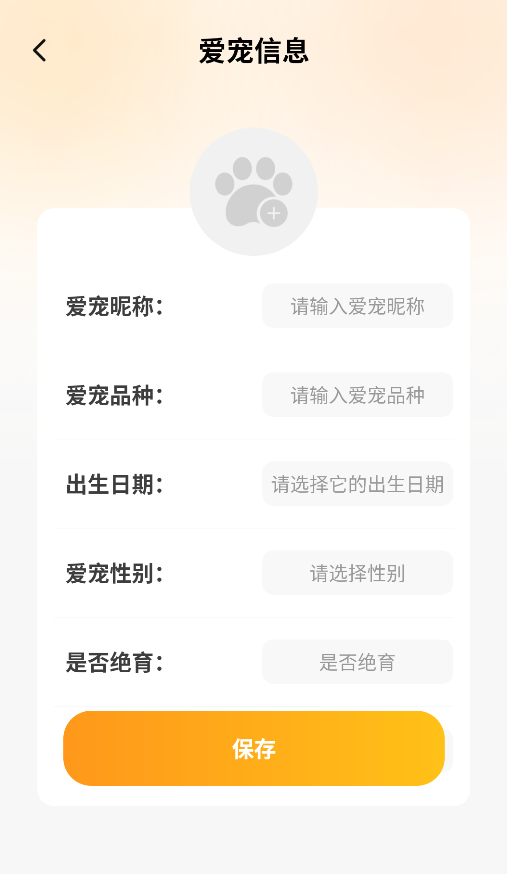 2、在宠物档案页填写详细信息,包括昵称、品种、年龄及绝育情况等基础资料。