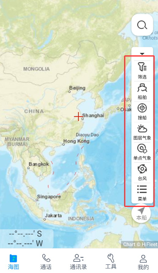 2、海图页面右侧提供多功能筛选栏:船舶定位、搜船查询、气象图层叠加及单点气象数据查询。
