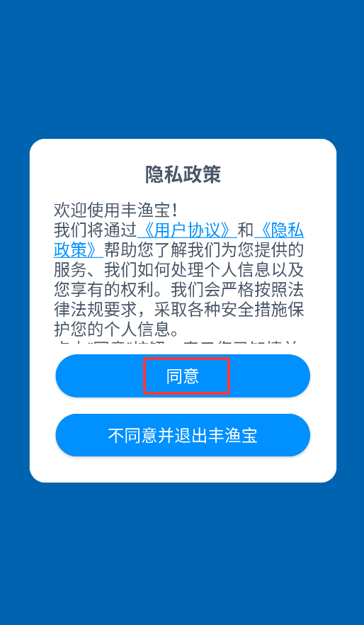 1、首次启动APP会弹出用户协议,点击"同意"后即可进入海洋渔业服务平台主界面。