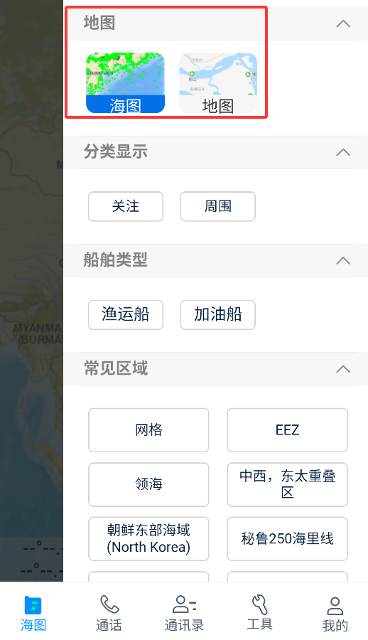 3、筛选设置支持海图/地图模式切换,可分类显示渔区、航道、禁航区等专业图层信息。