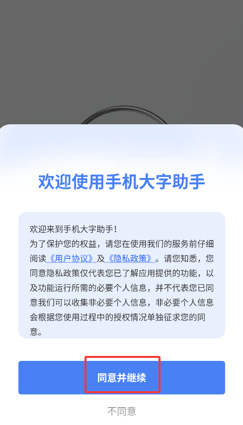 1、首次打开APP会显示用户协议和隐私政策,点击"同意并继续"按钮即可进入主界面。