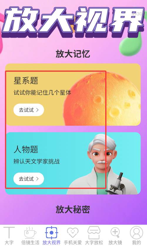 3、"挑战模式"中包含星系主题和人物主题两类趣味视觉训练题目。