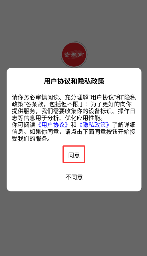 1、首次启动APP会弹出用户协议,点击"同意"后即可进入社交电商平台主界面。