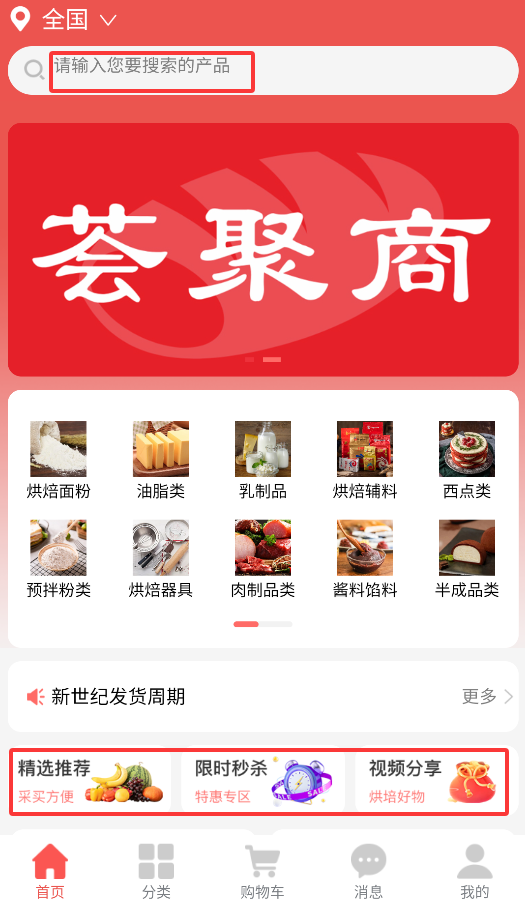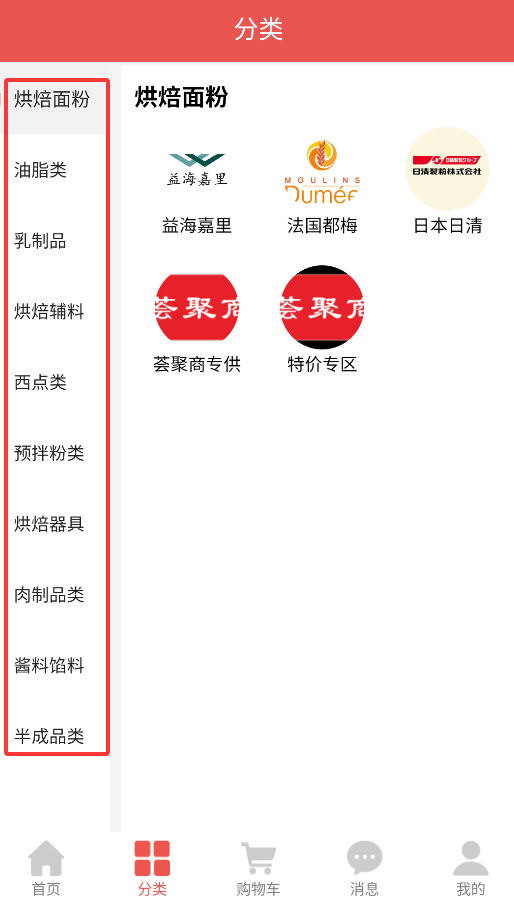 2、支持关键词搜索和多级分类浏览,涵盖烘焙器具、面粉、辅料等细分品类,帮助用户精准筛选目标商品。