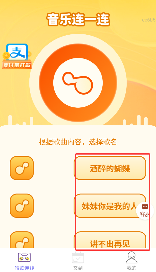 2、"音乐竞猜"通过歌曲片段连线游戏,答对歌名可获得现金红包奖励。