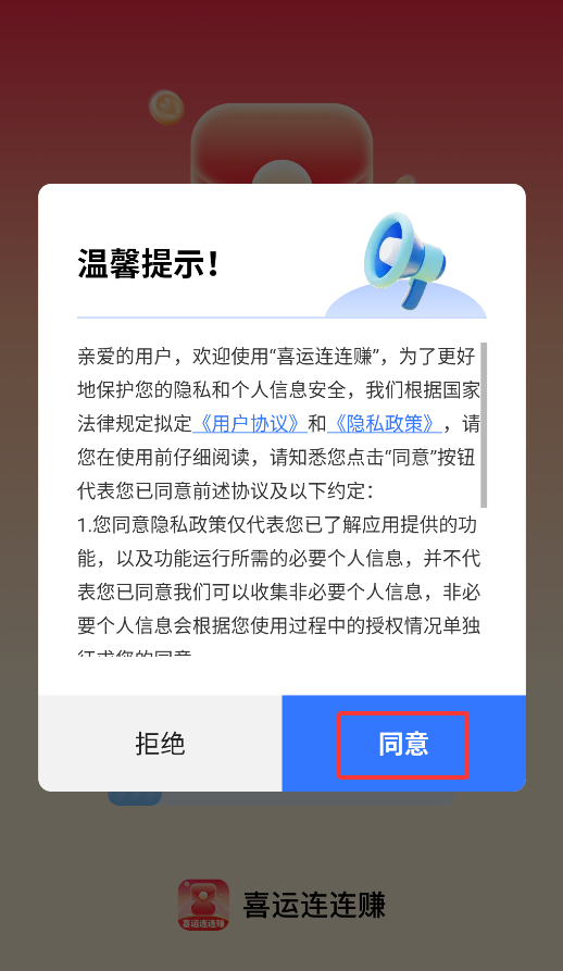 1、首次启动APP会显示用户协议弹窗,点击"同意"按钮后即可进入娱乐赚钱平台主界面。