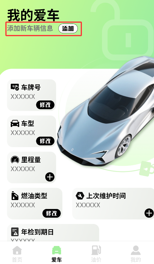 3、车辆管理页面支持添加爱车信息,包括行驶里程、燃油类型、保养记录和年检到期提醒等全方位数据记录。
