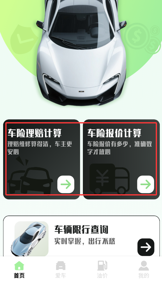 2、首页提供两大核心功能:车险理赔金额预估和实时保费报价计算,支持多家保险公司比价。