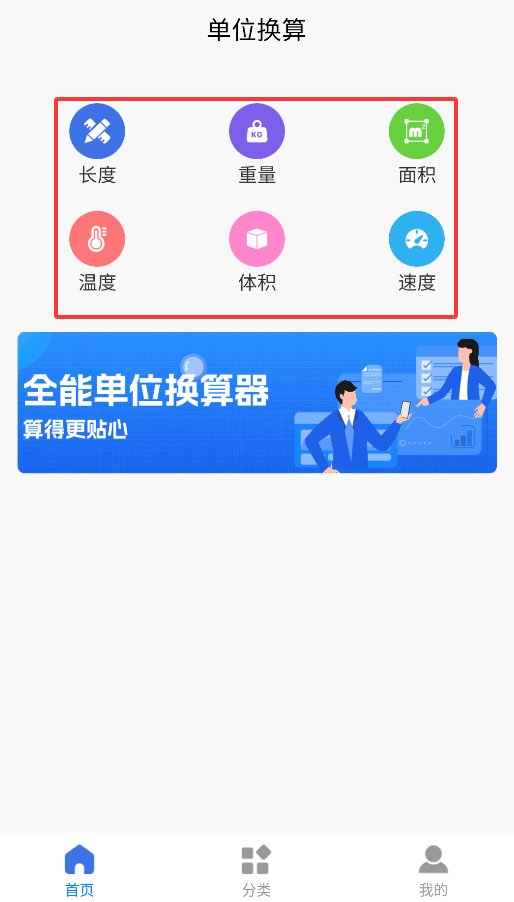 2、首页提供六大常用换算类别:长度、重量、面积、温度、体积和速度单位换算。