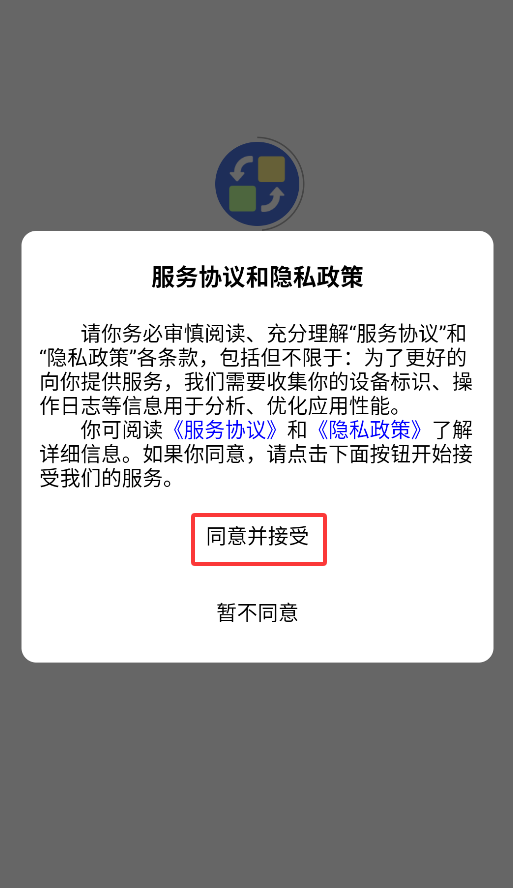 1、首次启动金信天单位换算APP时,系统会弹出用户协议窗口,点击"同意"按钮后即可进入主界面。