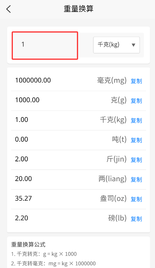3、以重量换算为例,输入数值后系统自动显示克、千克、磅、盎司等对应换算结果。