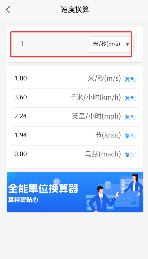 4、速度换算支持米/秒、千米/小时、英里/小时等单位互转,输入数值即可实时显示所有换算结果。