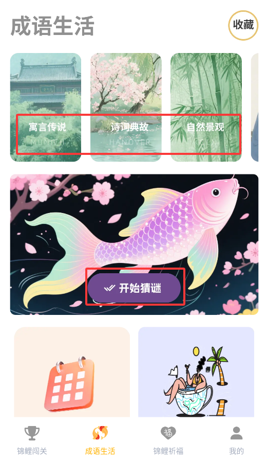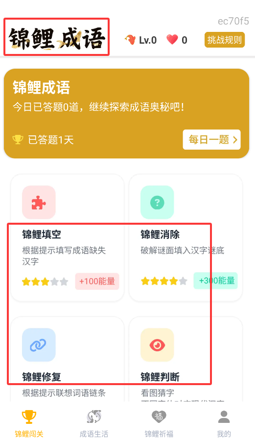 2、"闯关挑战"包含5种互动模式(填空/判断等),答对成语可收集幸运锦鲤。