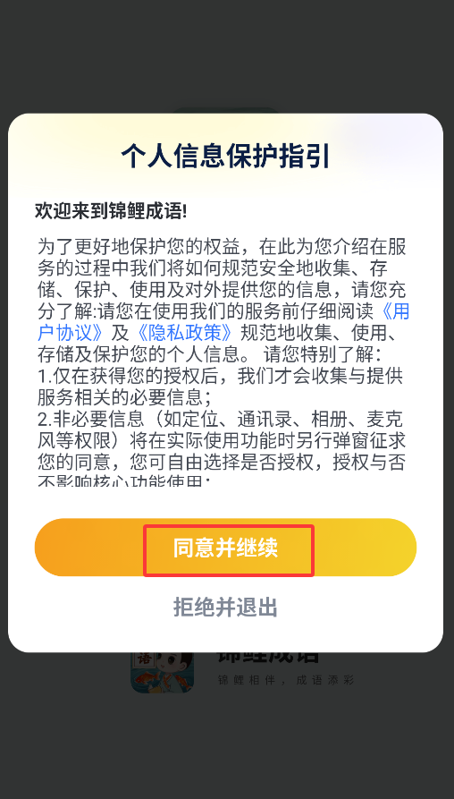 1、首次启动APP会显示用户协议弹窗,点击"同意"按钮后即可进入成语学习平台主界面。