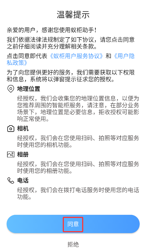 1、首次启动蚁柜助手APP时,系统会弹出用户协议确认窗口,点击"同意"按钮后方可进入登录页面。