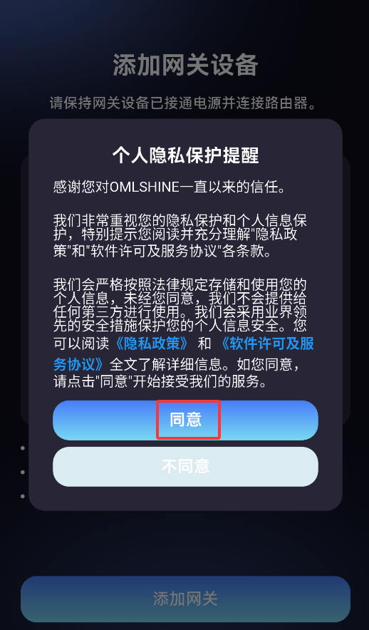 1、启动应用时会显示隐私协议页面,必须点击确认按钮才能进入设备管理主界面进行操作。