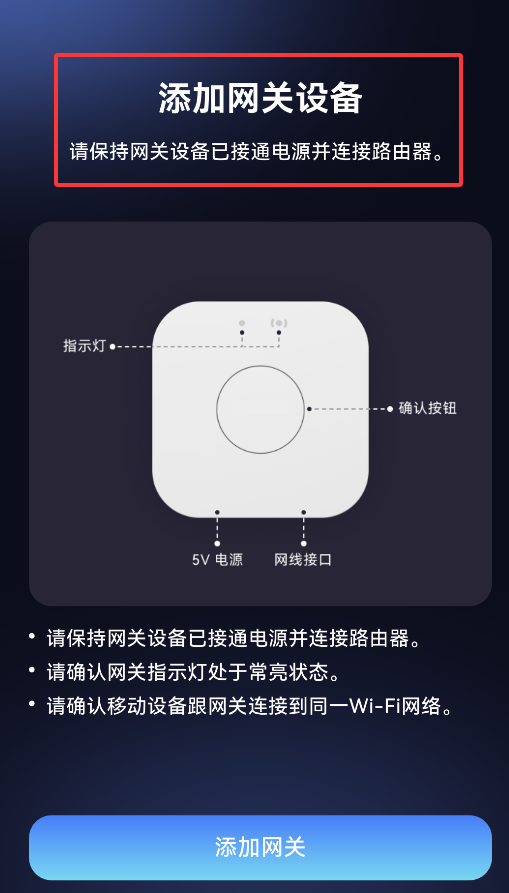 2、添加设备前需确保网关电源正常开启,并通过网线与路由器稳定连接,再点击界面中的添加按钮。