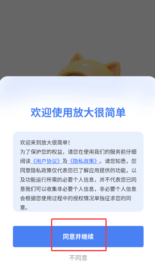1、首次启动APP会显示用户协议和隐私政策,点击"同意"按钮后即可进入主界面开始使用。