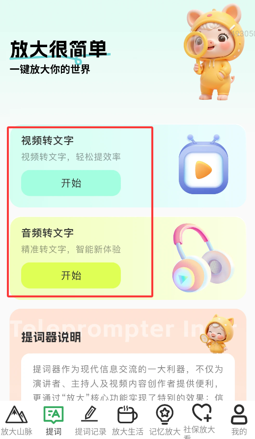 4、"提词"工具提供视频/音频转文字服务,支持多种格式文件导入和文字导出。