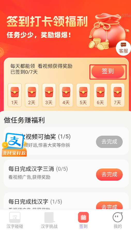 喜气一起赚这个APP挺有意思的,里面有几个玩汉字的小游戏。比如找不同汉字或者点一样的字消除,玩着玩着还能练眼力和反应。每天签个到就能领点奖励,做做小任务也能赚点零花钱。想找个轻松小游戏打发时间的可以试试,玩起来不费劲还挺有趣。