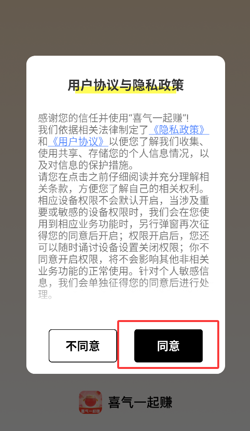 1、首次启动喜气一起赚APP时,系统会弹出用户协议确认窗口,点击"同意"按钮后方可进入应用主界面。