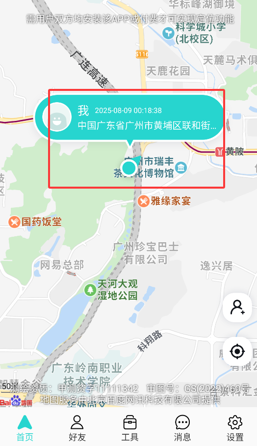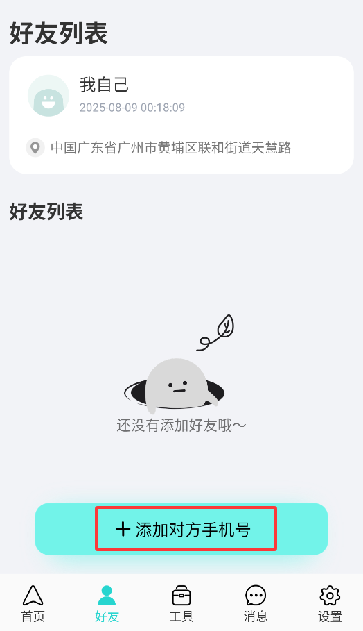 3、在好友管理页面,输入对方手机号码发送添加请求,通过后即可查看好友实时位置(需对方授权)。