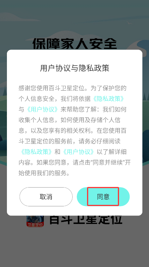 1、首次启动百斗卫星定位APP时,系统会弹出用户协议窗口,点击"同意"按钮后即可进入主界面。