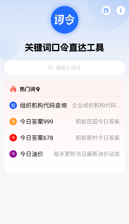 1、启动APP后,首页会展示当前热门搜索词令和常用快捷指令,方便快速选择使用。