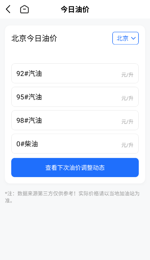 2、以查询油价为例,点击"今日油价"功能后选择所在城市,即可立即获取最新油价信息。