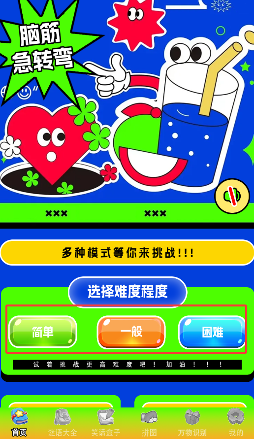 2、首页提供难度分级功能,可选择简单/一般/困难三种级别的脑筋急转弯挑战。